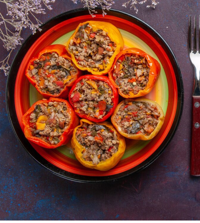 Gevulde paprika’s, met kipgehakt en parmesan Tomatensaus met groenten & orzo