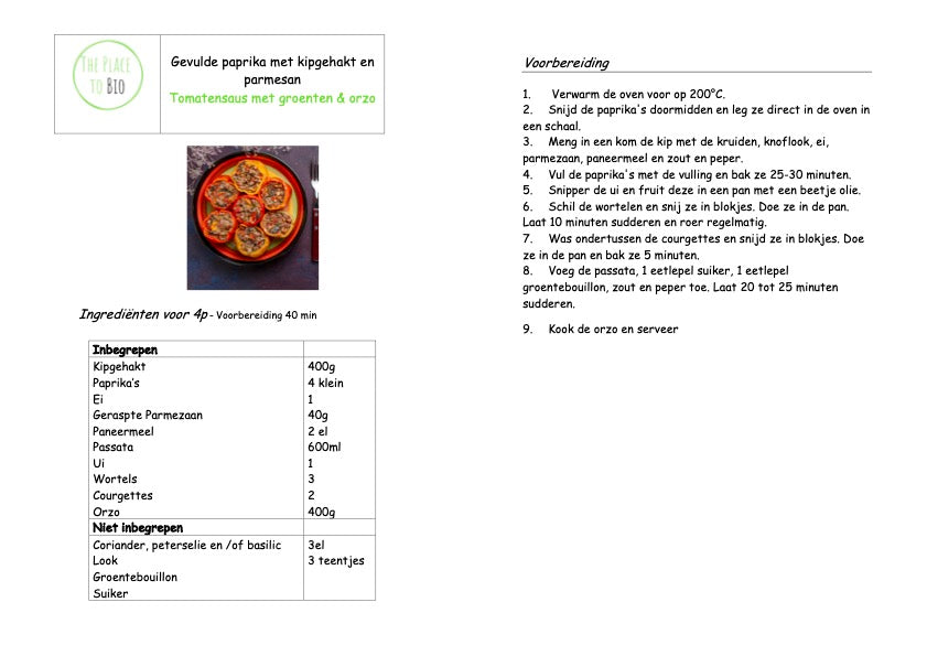 Gevulde paprika’s, met kipgehakt en parmesan Tomatensaus met groenten & orzo