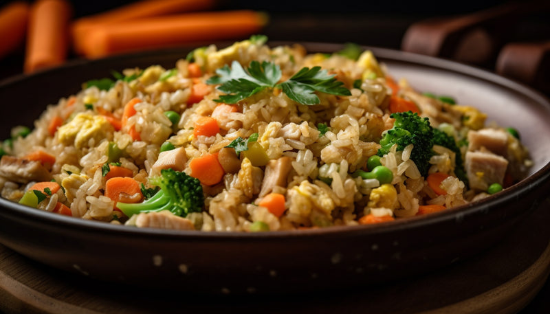 Gebakken rijst met cashewnoten, paprika, courgettes & kip