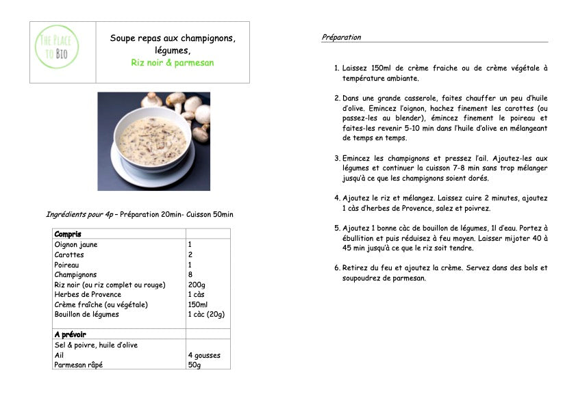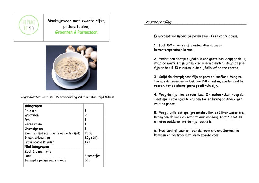 Maaltijdsoep met zwarte rijst, paddestoelen, Groenten & Parmezaan