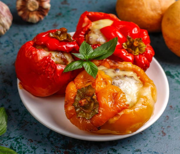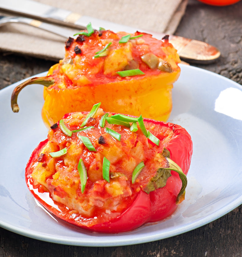 Gevulde paprika’s Met aubergines en tomaten Volkoren penne en passata